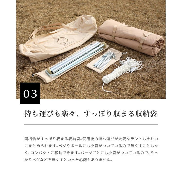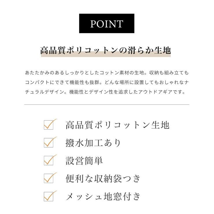 あたたかみのあるしっかりとしたコットン素材の生地を使用。 収納も組み立てもコンパクトにできて機能も抜群。 どんなギアとも合わせやすくおしゃれなナチュラルデザイン。 機能性とデザイン性を追求したアウトドアギアです。