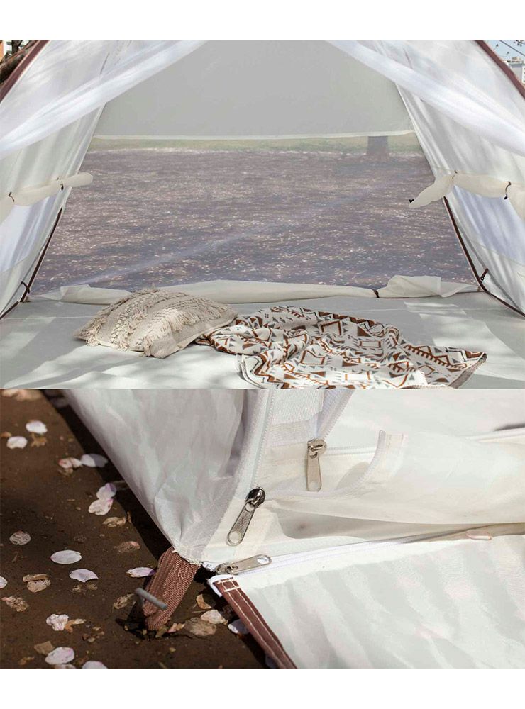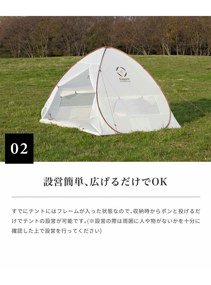 すでにテントにはフレームが入った状態なので、収納袋から広げるだけでテントの設営が可能です。(設営の際は周囲に人や物がないことを十分に確認した上で設営を行ってください。)