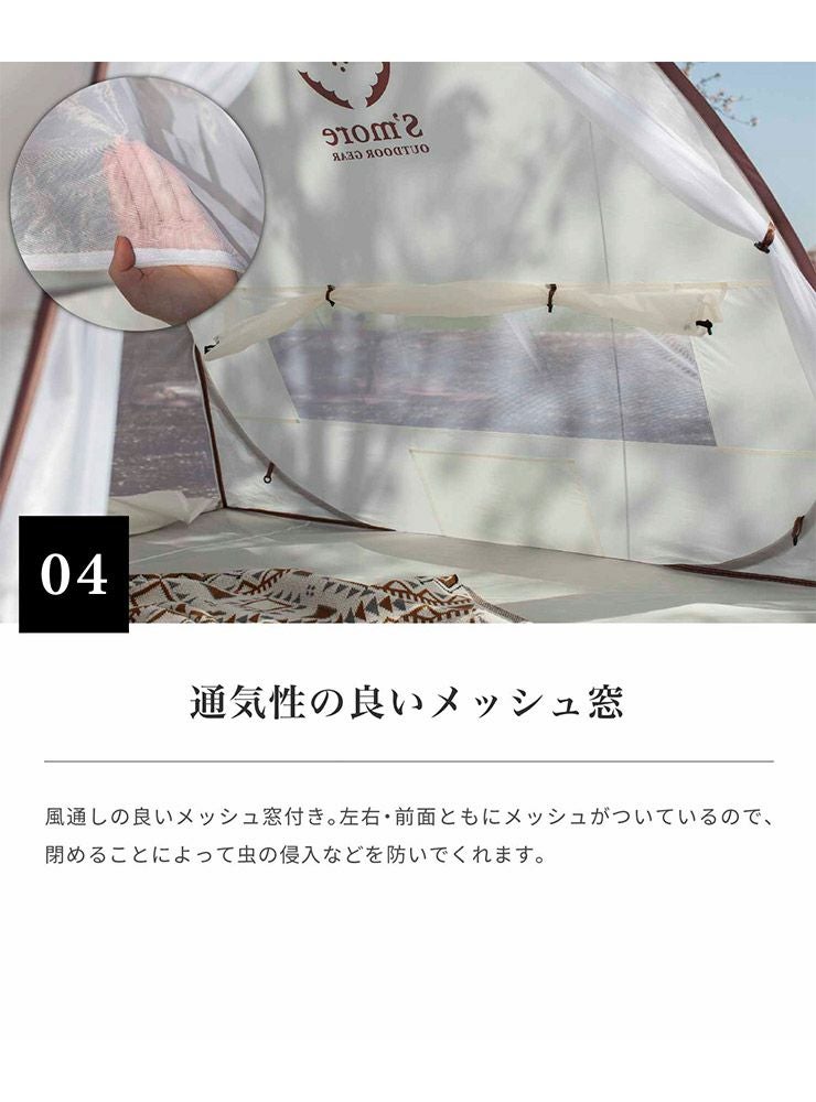 風通し良い広めのメッシュ窓付き。メッシュ部分にはS'moreのロゴがさりげなく入っているのがポイント。