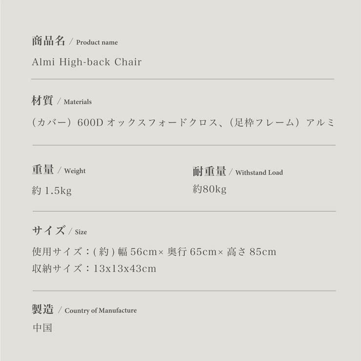 カバー:600Dオックスフォードクロス、足枠フレーム:アルミ